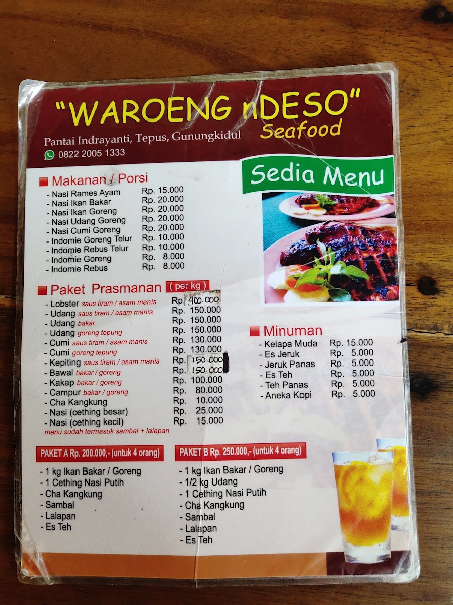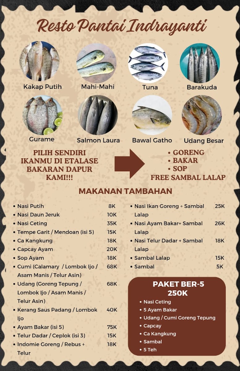 If you’re curious about what to order at Resto Pantai,indrayanti Menu, get ready for a lineup that fits perfectly with a breezy beach day in Pantai, Tepus, Gunungkidul Regency, Special Region of Yogyakarta. The menu leans into fresh seafood, and you can taste it straight away. Grilled fish arrives smoky and tender, often served with warm rice, sambal that packs a punch, and crisp lalapan on the side. It’s simple, but it hits the spot after hours under the sun.